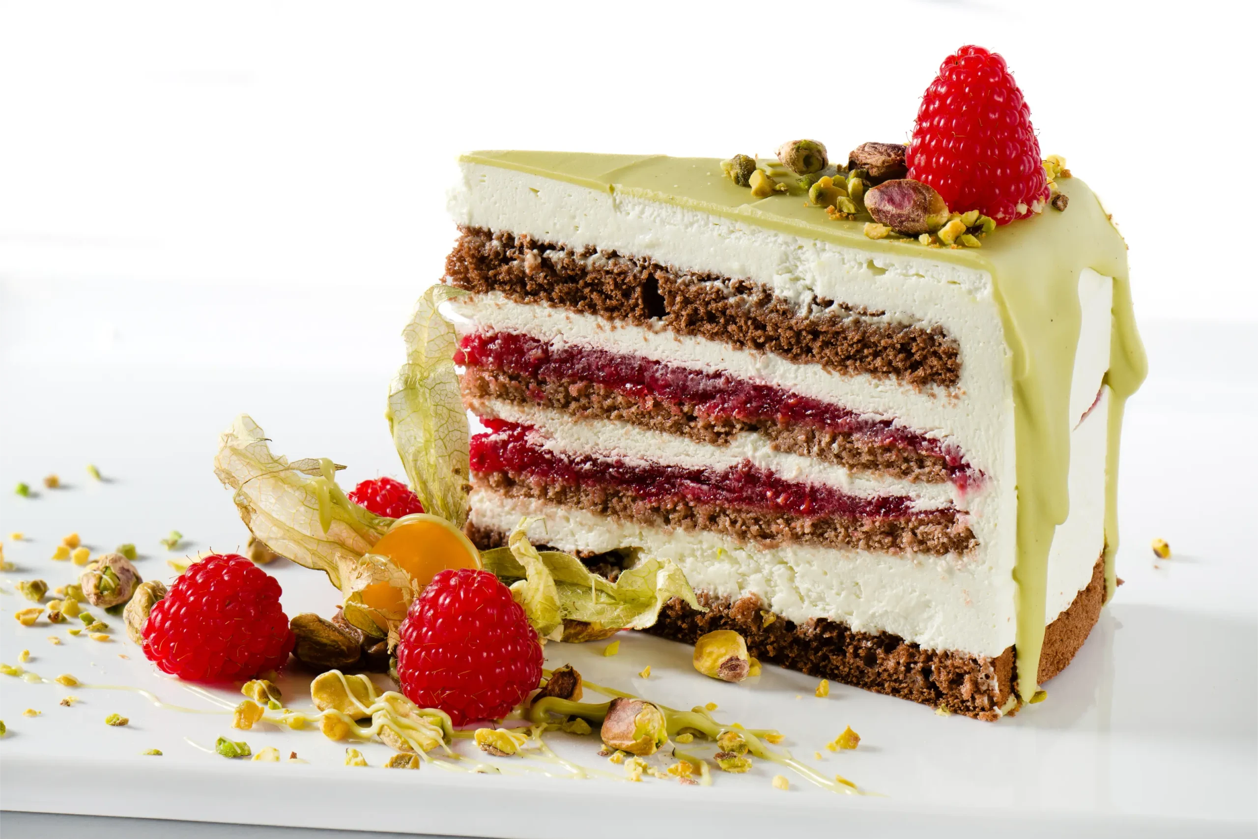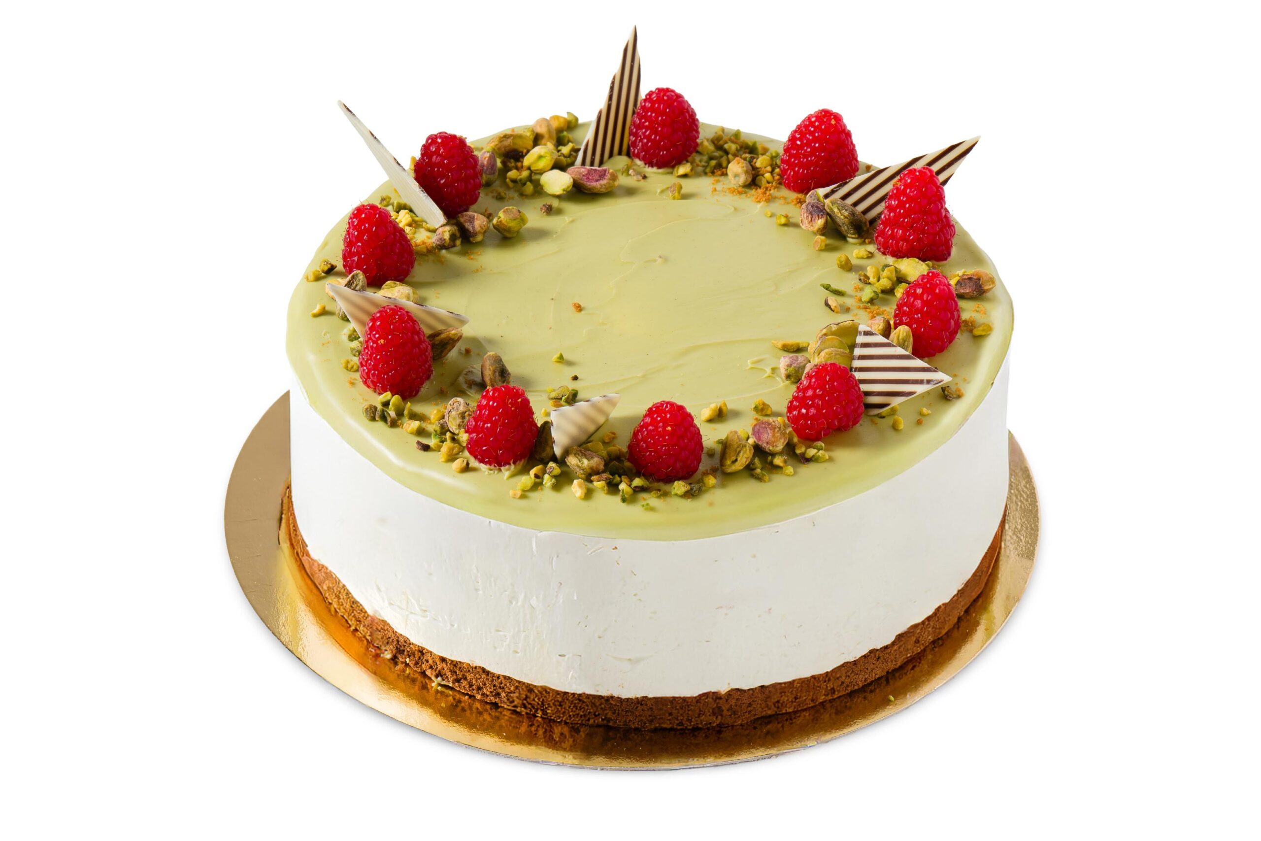 Pistacija malina je torta, ki očara s svojo elegantno podobo in prefinjeno igro okusov. Nežna krema s pistacijo razvaja s svojo svilnato teksturo in bogato aromo, medtem ko malinov vložek prinese ravno pravo mero svežine in prijetne kislosti. Med plastmi se prepletajo mehak črni biskvit, lahkotna krema in sadna sočnost maline, vse skupaj pa ustvari popolno harmonijo okusov. Zaključek s pistacijo doda piko na i tej razkošni sladici.